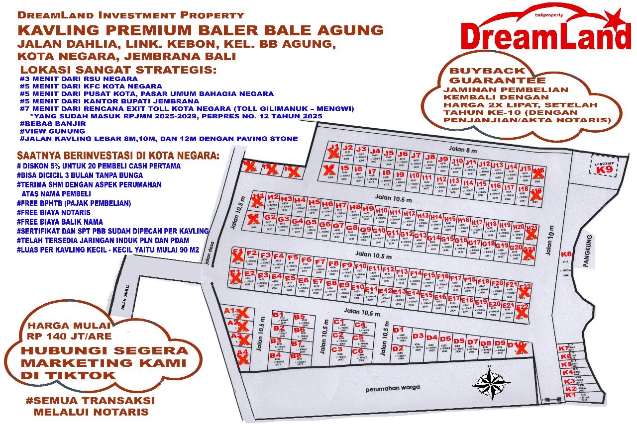 Dedo DreamLand mempersembahkan Kavling Premium Baler Bale Agung berlokasi di Jalan Dahlia, Lingkungan Kebon, Kelurahan BB Agung, Kota Negara, Jembrana – kawasan strategis yang dikelilingi fasilitas penting. Hanya 3 menit dari RSU Negara, 5 menit menuju pusat kota, pasar umum, KFC, kantor bupati, serta 7 menit dari rencana exit tol Gilimanuk–Mengwi, membuat kavling ini sangat potensial baik untuk hunian maupun investasi. Setiap kavling memiliki akses jalan lebar 8–12 meter yang sudah menggunakan paving stone, bebas banjir, dengan pemandangan gunung yang asri.