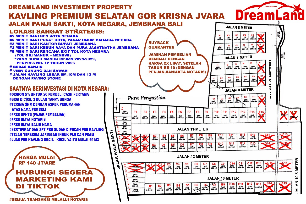 Dedo DreamLand mempersembahkan Kavling Premium Selatan GOR Krisna Jvara, berlokasi di Jalan Panji Sakti, Kota Negara, Jembrana – kawasan strategis dengan akses mudah hanya beberapa menit dari fasilitas penting. Lokasi hanya 1 menit dari Kebun Raya dan Pura Jagatnatha Jembrana, 2 menit ke Kantor Bupati, 5 menit ke pusat kota, pasar umum, dan KFC, serta 5 menit menuju rencana exit tol Gilimanuk–Mengwi yang termasuk Proyek Strategis Nasional 2025–2029. Kavling ini menawarkan lingkungan nyaman dengan view gunung dan persawahan, jalan lebar 8–12 meter berlapis paving stone, serta bebas banjir.